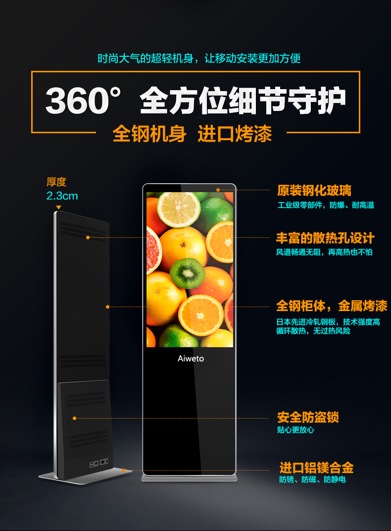 AW-CM650L01 立式觸摸一體機(jī)采用全高清(1920*1080)液晶面板,具有178度視角,高對(duì)比度和亮度,3D數(shù)字降噪,智能消除殘影、重影等失真現(xiàn)象,使得顯示畫(huà)面更清晰,穩(wěn)定,色彩更鮮艷。可廣泛運(yùn)用于快餐店、訂票處、學(xué)校、機(jī)場(chǎng)、酒店大堂、交易所、電影院、企業(yè)、會(huì)展展館、商場(chǎng)等場(chǎng)所。