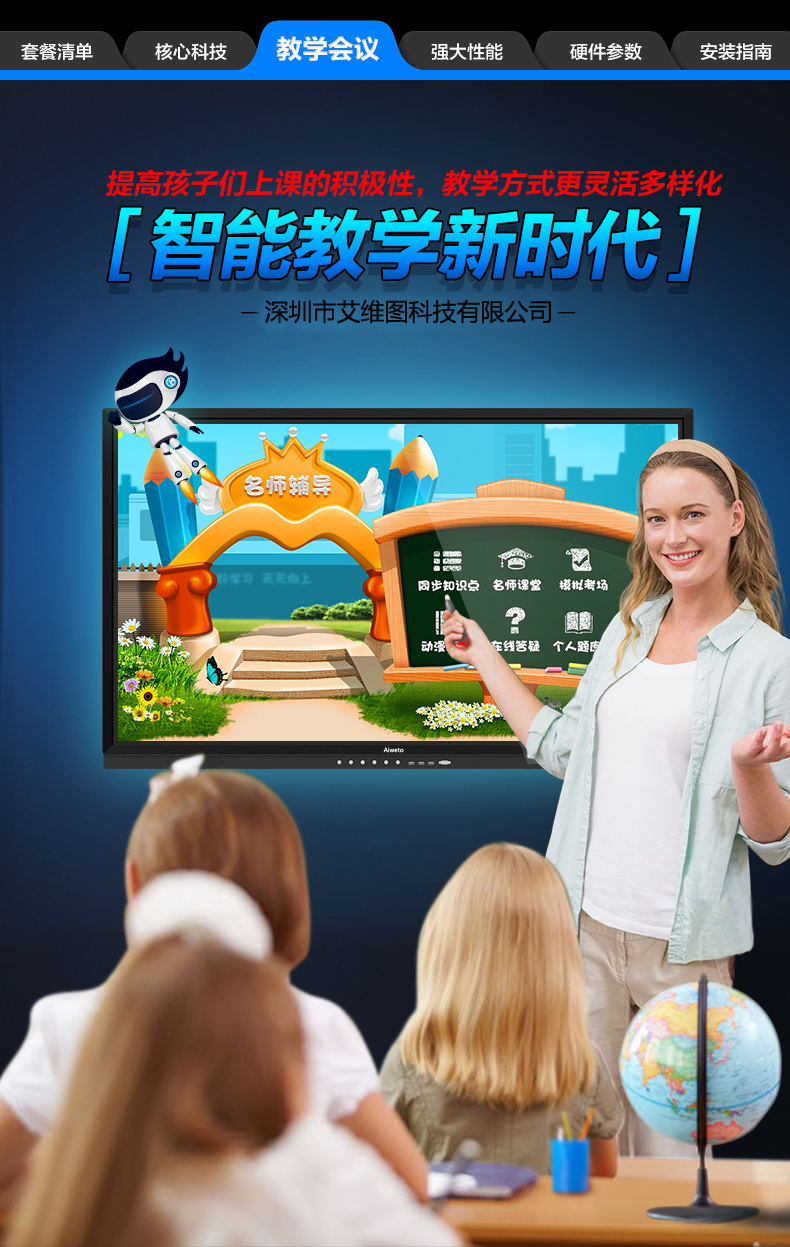 AW系列-多媒體教學(xué)一體機,高清大屏顯示,壁掛支架多種使用方式,人性化機型設(shè)計,立式與掛式兩種使用方法可交替使用,避免使用環(huán)境發(fā)生變化時產(chǎn)生的資源浪費問題采用LED背光源長壽命,低功耗,環(huán)保節(jié)能。智能電子白板,各種文件一鍵加載,多點觸控智能電子白板適用于各種商務(wù)會議,支持手寫批注,兼容日常office辦公軟件,本地、U盤、網(wǎng)盤、局域網(wǎng)數(shù)據(jù)輕松駕馭。書寫流暢,減少視覺誤差,高端企業(yè)必備,多重主題背景,筆形色彩,任意選擇。高端配置 讓運行速度,完美兼容WIN7,WIN8 隨意切換。