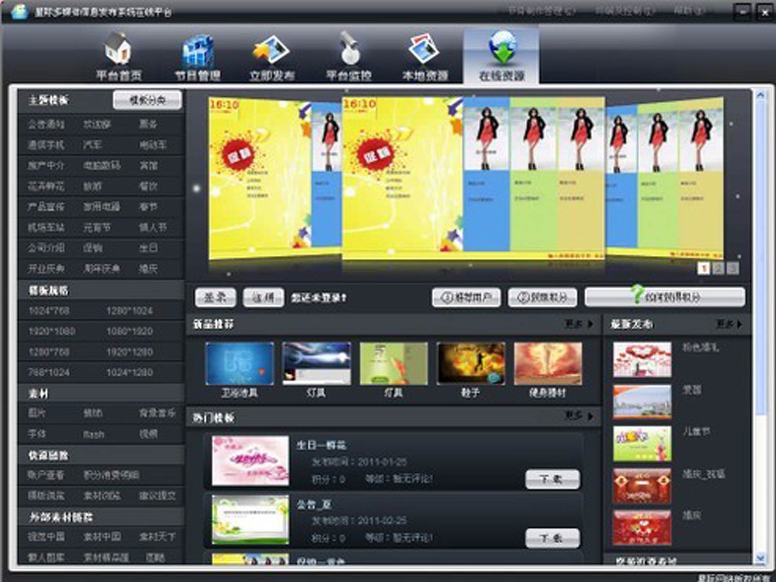 多樣表現(xiàn)方式 視覺盛宴 支持視頻、圖片、文字、滾動字幕、及時數據等多種素材顯示,支持全屏與分屏顯示節(jié)目,支持多臺機器同步播放,超震撼視覺效果 |